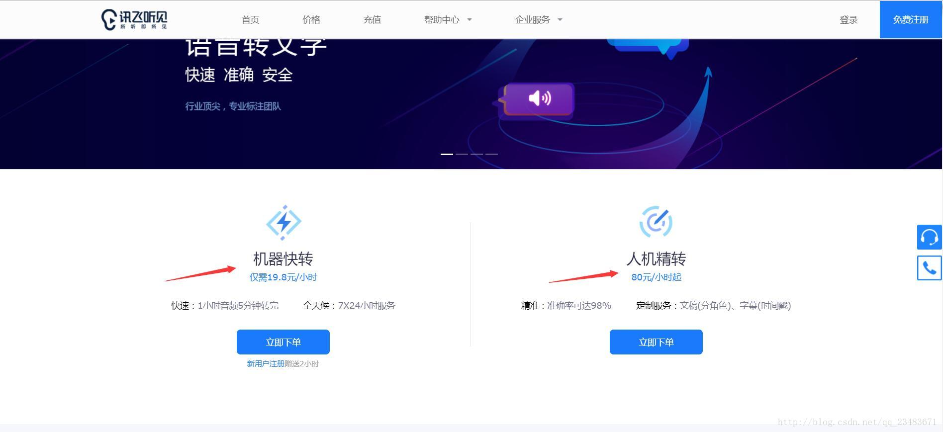 首先打开讯飞听见,遗憾的是,讯飞的这个语音识别功能是要收费的,看下价格,一种是机器快转(19.8元/小时),另一种是人机精转(80元/小时),看到这里,你是否心想:妖,都要收费的,我一个农村来的怎么负担得起。别急,我也是这样想的,继续往下看。点击上图的立即下单