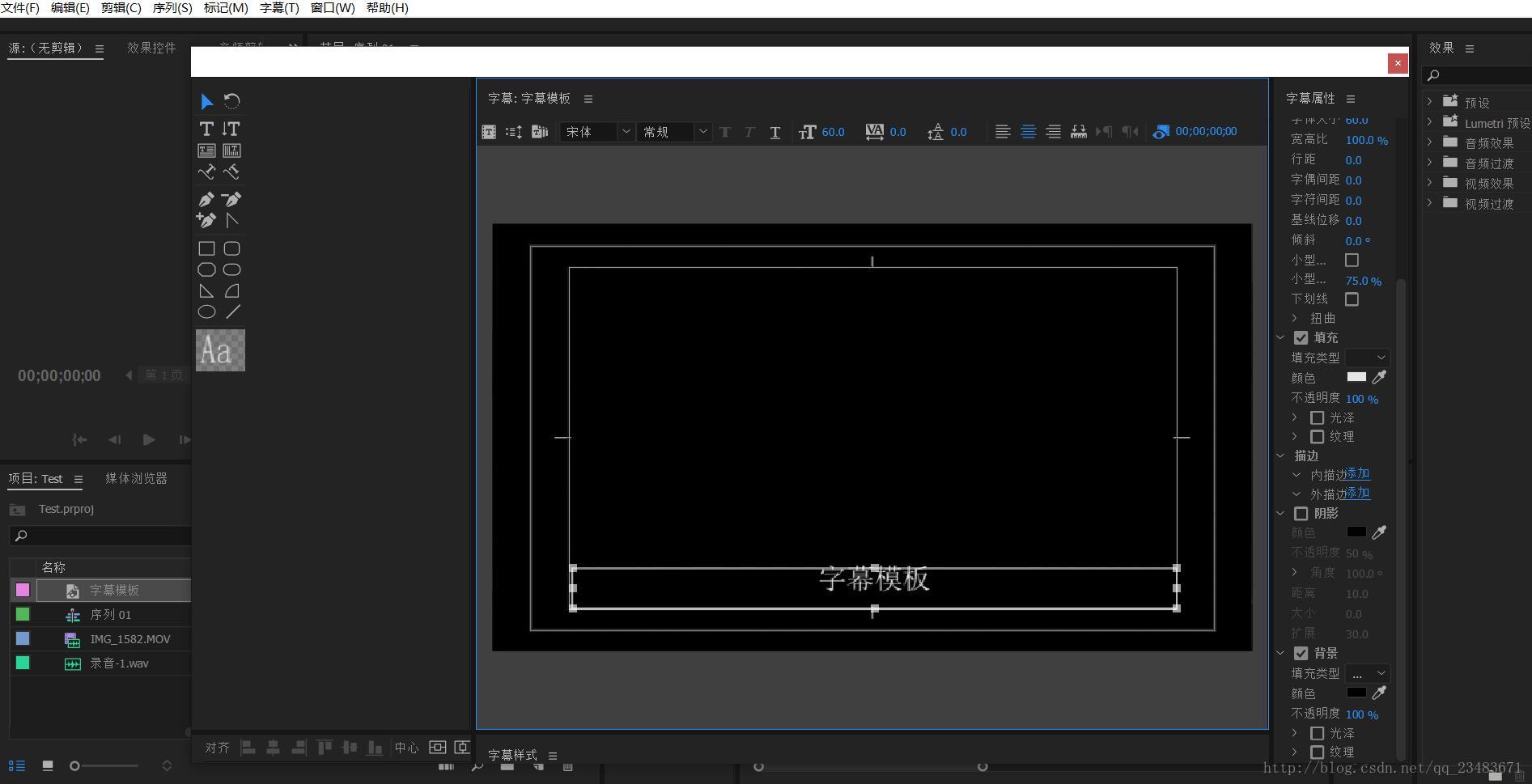 字幕文本保存好后,接下来就要生成一个字幕模板,这里使用的Premiere CC pro 2017软件。打开PR,先根据自己的喜好制作一个字幕样式当作字幕模板。接着选中字幕模板->文件->导出->标题,就可以生成一个字幕模板