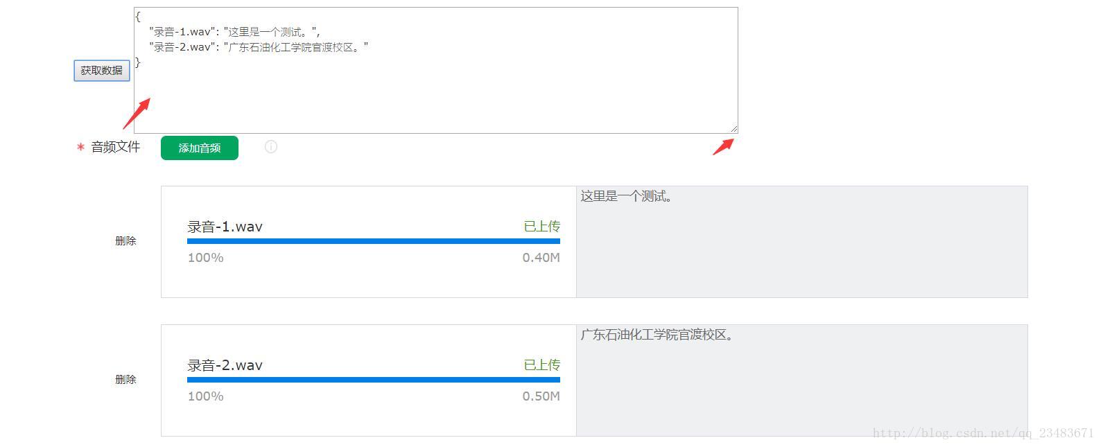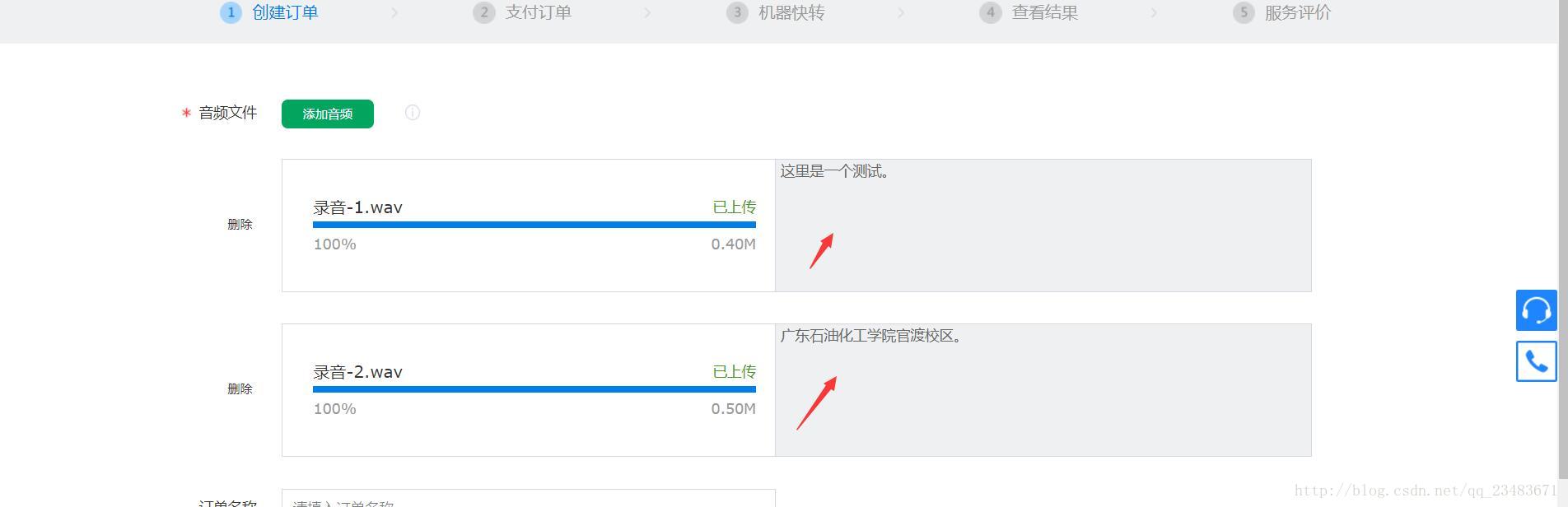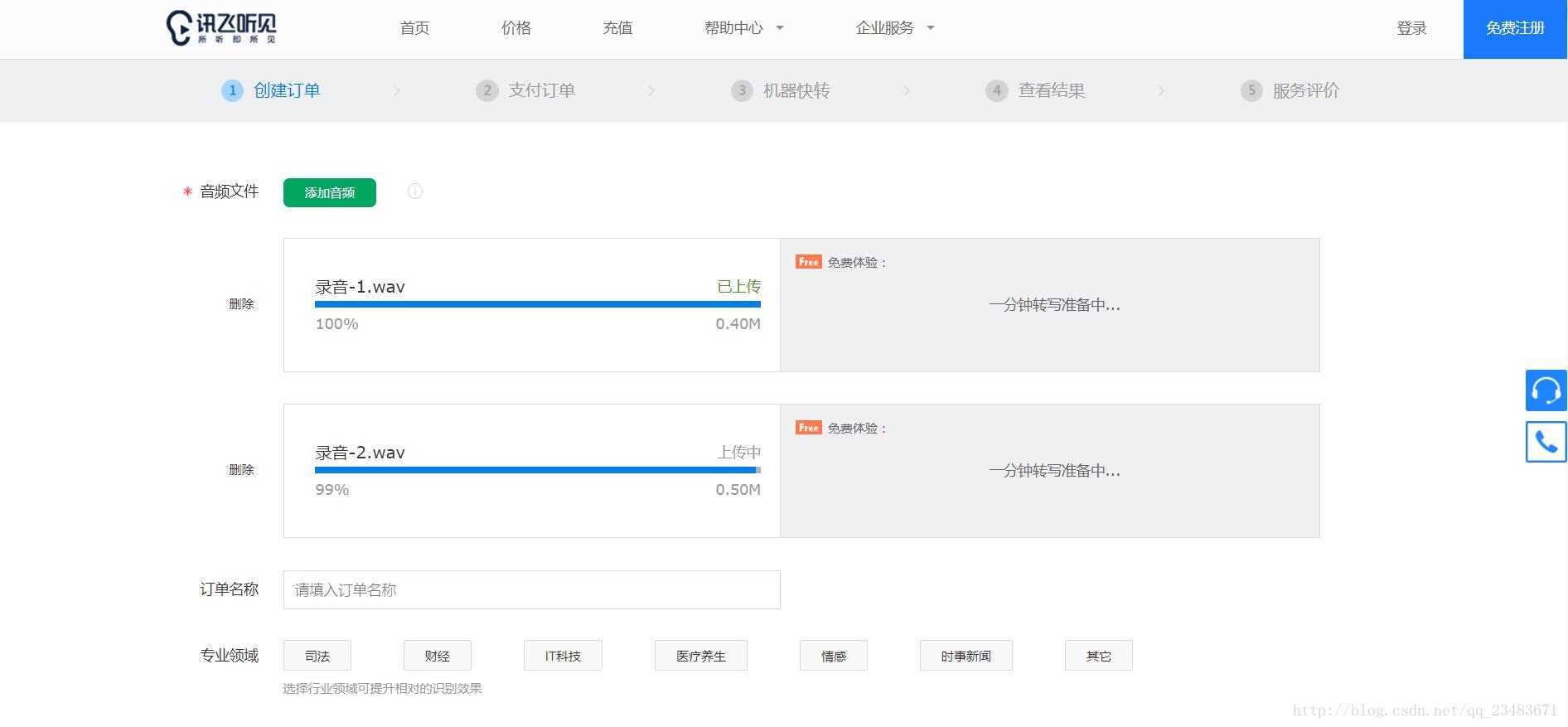 进入到这个页面,我们可以发现讯飞提供了一个体验的功能,就是你可以上传一段录音来体验一下他们家的这个语音识别功能,当然它是有限制的,你最多可以同时上传50条语音,每条语音不超过500M且不超过1分钟时长。所以说,这个功能对后期才配音的人员就比较友好。当然找个工具分割一下语音也是可以的,有空我再看看能不能写段代码实现语音分割。这里我上传了两条语音来试一下