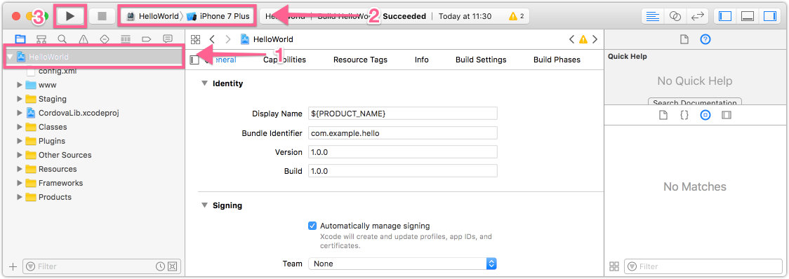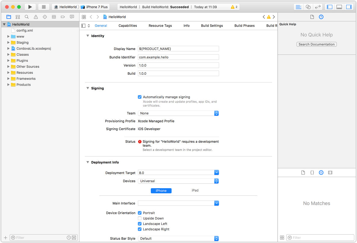$ open ./platforms/ios/HelloWorld.xcworkspace/