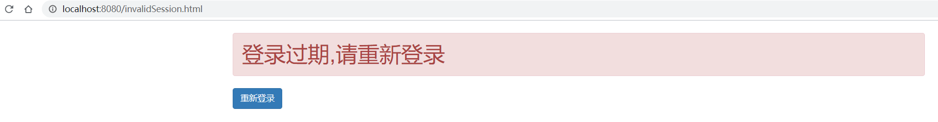 | <html xmlns:th="http://www.thymeleaf.org"> <head> <meta content="text/html;charset=UTF-8"/> <meta name="viewport" content="width=device-width, initial-scale=1"/> <link th:href="@{/css/bootstrap.min.css}" rel="stylesheet"/> </head> <body> <div class="container"> <h1 class="alert alert-danger" >登录过期,请重新登录</h1> <a class="btn btn-primary" th:href="@{/login}" >重新登录</a> </div>