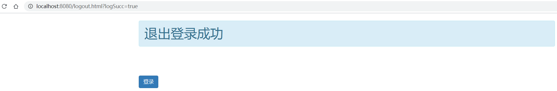 <h1 id="success" class="alert alert-info" th:if="${param.logSucc}" >退出登录成功</h1> <br/><br/><br/> <a class="btn btn-primary" th:href="@{/login}" >登录</a> </div> </body>