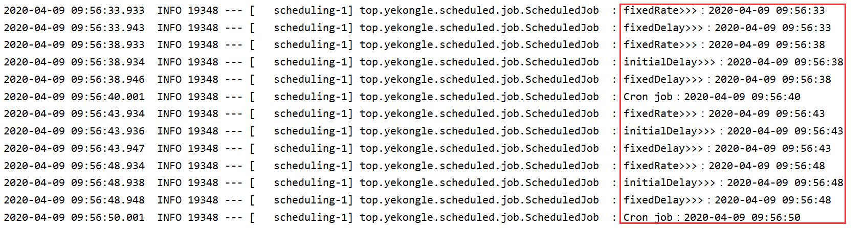 1 2 3 4 5 6 7 8 9 10 11 12 13 14 15 16 17 18 19 20 21 22 23 24 25 26 27 28 29 30 31 32 33 34 35 36 37 38 39 40 41 42 43 package top.yekongle.scheduled.job;import java.text.SimpleDateFormat;import java.util.Date;import org.springframework.scheduling.annotation.Scheduled;import org.springframework.stereotype.Component;import lombok.extern.slf4j.Slf4j;@Component @Slf4j public class ScheduledJob { private static final SimpleDateFormat format = new SimpleDateFormat ("yyyy-MM-dd HH:mm:ss" ); @Scheduled(fixedRate = 5000) public void fixedRate () { log.info("fixedRate>>>:{}" , format.format(new Date ())); } @Scheduled(fixedDelay = 5000) public void fixedDelay () { log.info("fixedDelay>>>:{}" , format.format(new Date ())); } @Scheduled(initialDelay = 5000, fixedDelay = 5000) public void initialDelay () { log.info("initialDelay>>>:{}" , format.format(new Date ())); } @Scheduled(cron = "0/10 * * * * *") public void startJob () { log.info("Cron job:{}" , format.format(new Date ())); } }