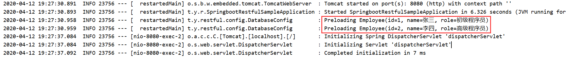 @Bean public CommandLineRunner initDatabase(EmployeeRepository repository) { return args -> { log.info("Preloading " + repository.save(new Employee("张三", "初级程序员"))); log.info("Preloading " + repository.save(new Employee("李四", "高级程序员"))); }; } }