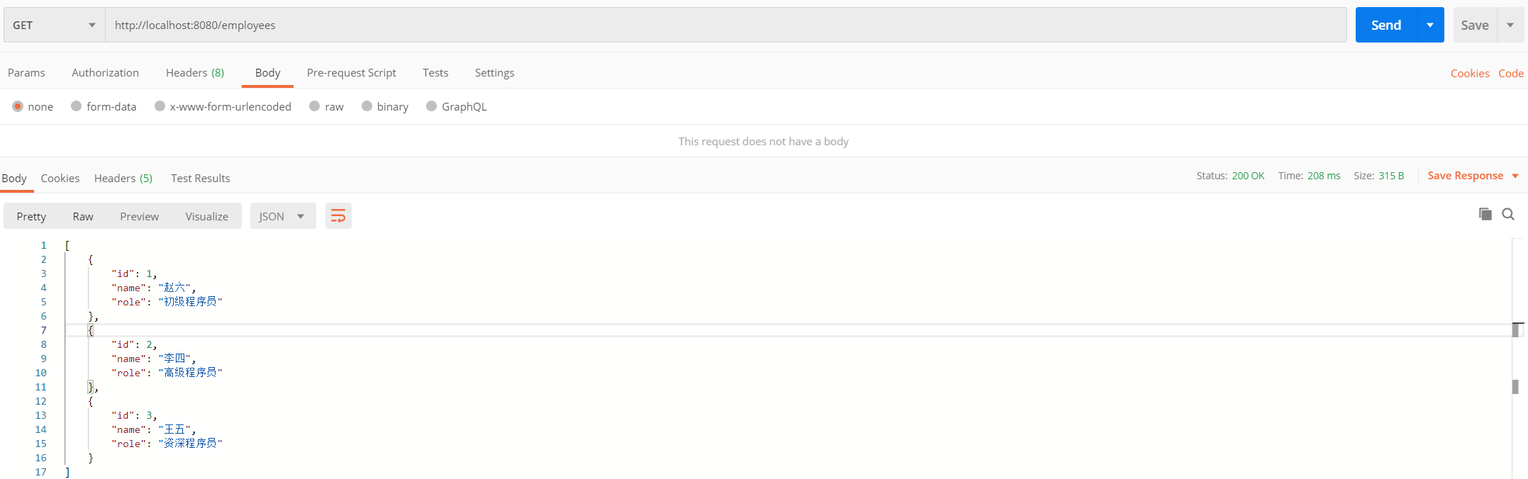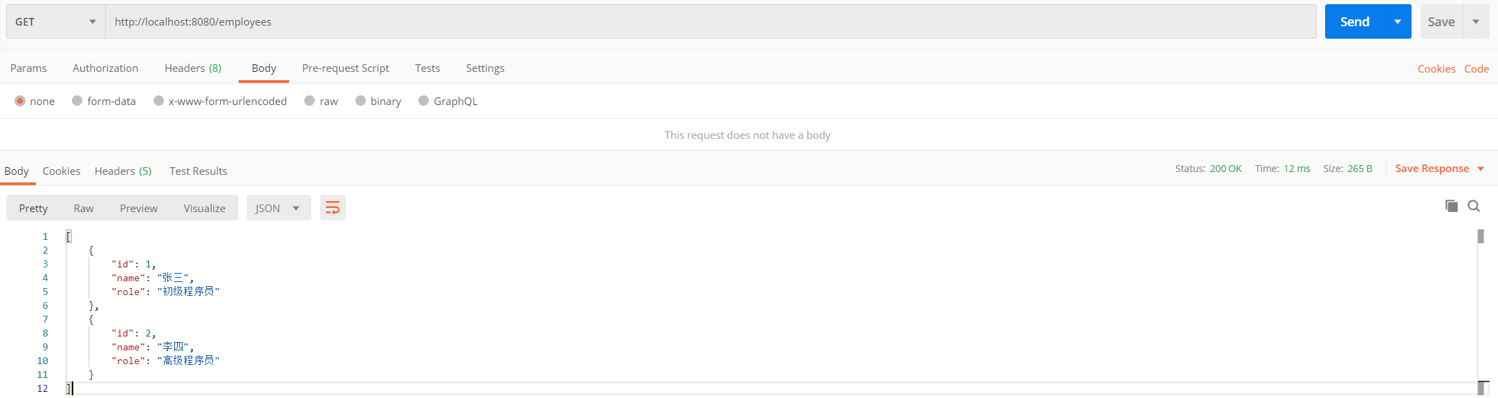 @GetMapping("/employees") public ResponseEntity<?> all() { List<Employee> employeeList = repository.findAll(); return ResponseEntity.ok(employeeList); }