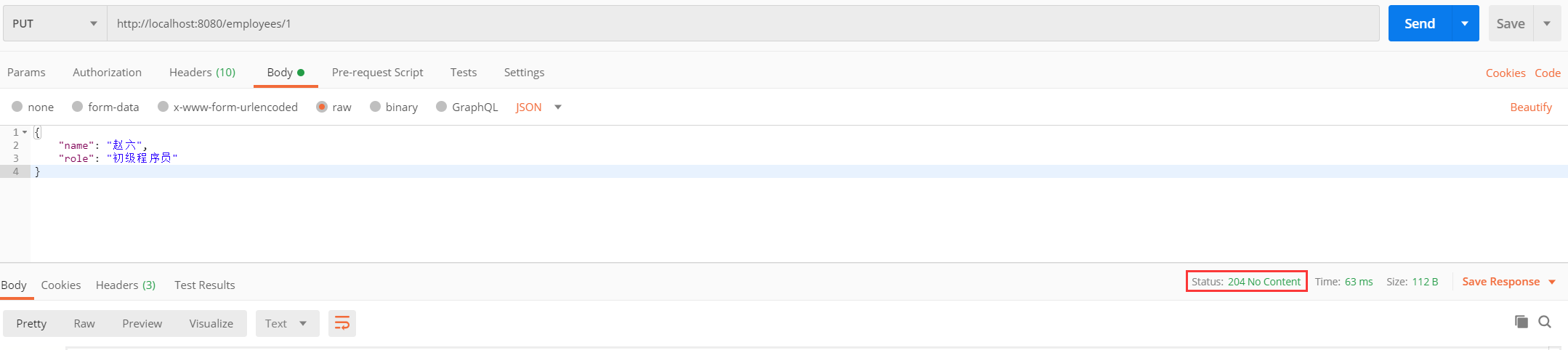 将 id 为 1 的员工名字改为赵六:http://localhost:8080/employees/1