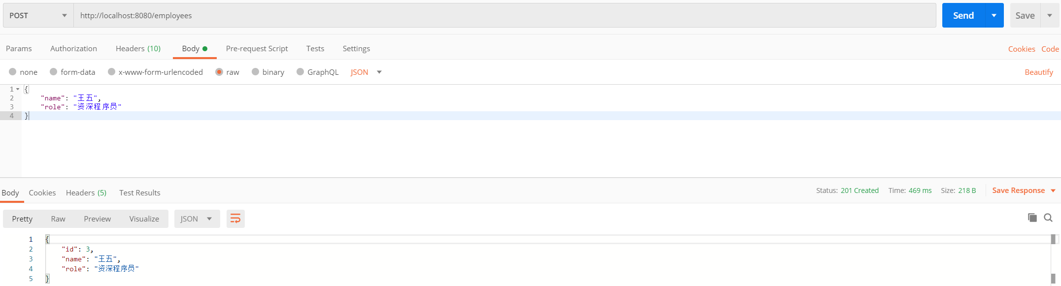 @PostMapping("/employees") public ResponseEntity<?> newEmployee(@RequestBody Employee newEmployee) { repository.save(newEmployee); return ResponseEntity.status(HttpStatus.CREATED).body(newEmployee); }