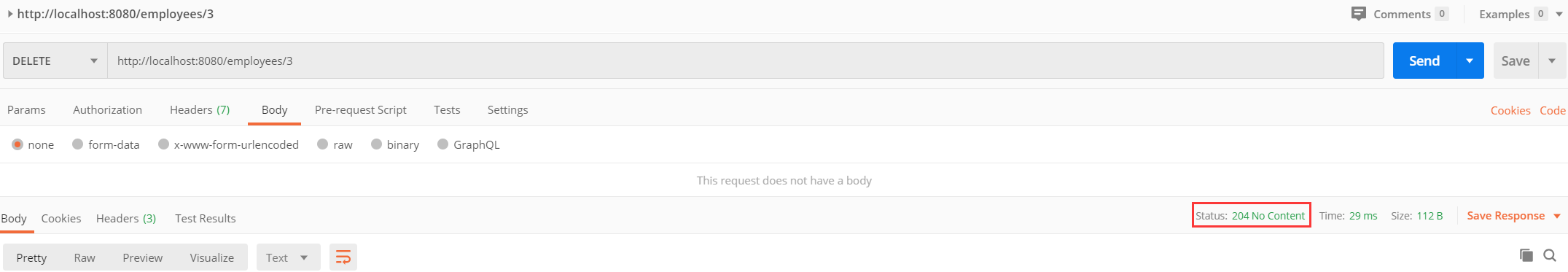@DeleteMapping("/employees/{id}") public ResponseEntity<?> deleteEmployee(@PathVariable Long id) { repository.deleteById(id); return ResponseEntity.noContent().build(); } }