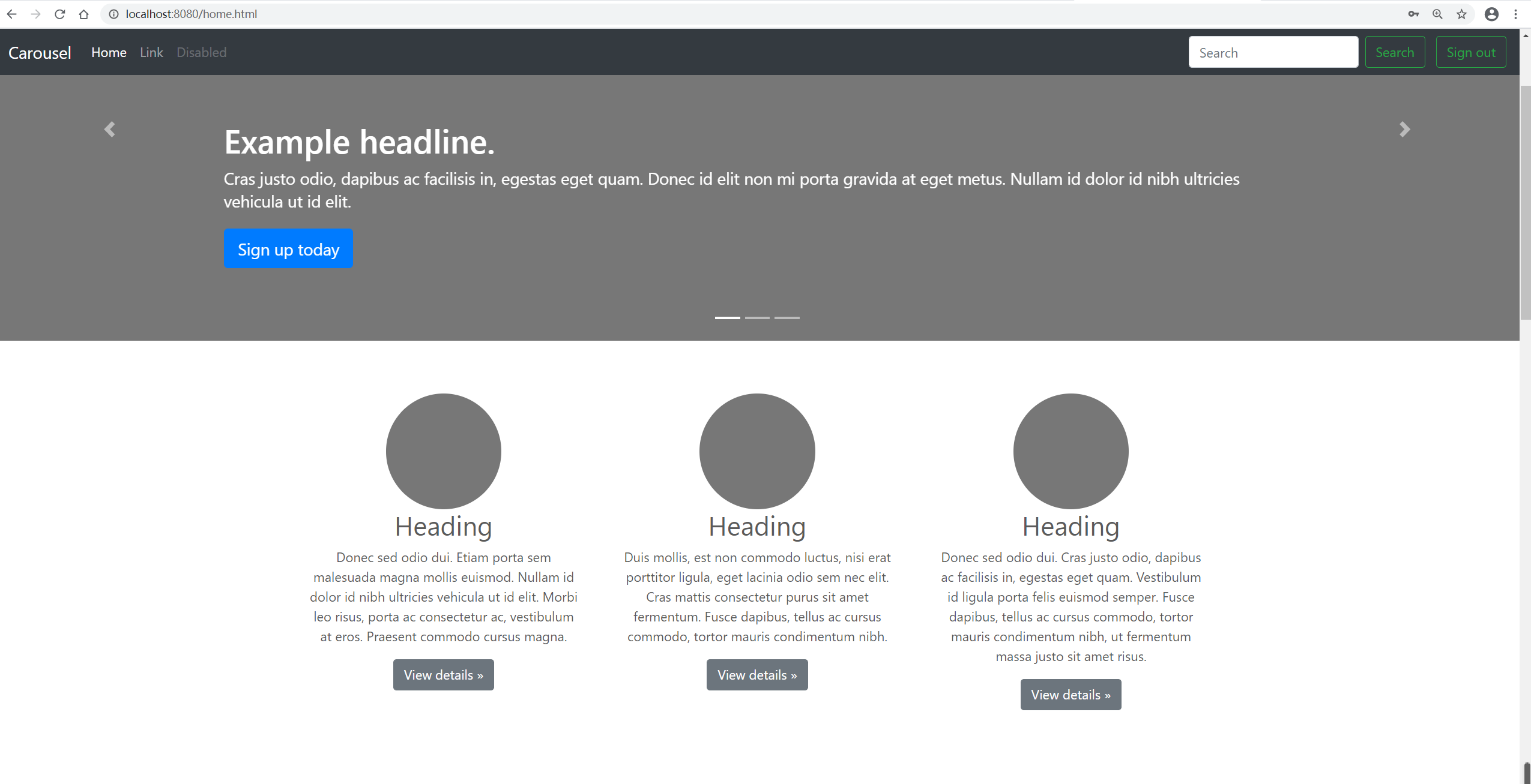 <div class="row"> <div class="col-lg-4"> <svg class="bd-placeholder-img rounded-circle" width="140" height="140" xmlns="http://www.w3.org/2000/svg" preserveAspectRatio="xMidYMid slice" focusable="false" role="img" aria-label="Placeholder: 140x140"><title>Placeholder</title><rect width="100%" height="100%" fill="#777"></rect><text x="50%" y="50%" fill="#777" dy=".3em">140x140</text></svg> <h2>Heading</h2> <p>Donec sed odio dui. Etiam porta sem malesuada magna mollis euismod. Nullam id dolor id nibh ultricies vehicula ut id elit. Morbi leo risus, porta ac consectetur ac, vestibulum at eros. Praesent commodo cursus magna.</p> <p><a class="btn btn-secondary" href="https://v4.bootcss.com/docs/examples/carousel/#" role="button">View details »</a></p> </div> <div class="col-lg-4"> <svg class="bd-placeholder-img rounded-circle" width="140" height="140" xmlns="http://www.w3.org/2000/svg" preserveAspectRatio="xMidYMid slice" focusable="false" role="img" aria-label="Placeholder: 140x140"><title>Placeholder</title><rect width="100%" height="100%" fill="#777"></rect><text x="50%" y="50%" fill="#777" dy=".3em">140x140</text></svg> <h2>Heading</h2> <p>Duis mollis, est non commodo luctus, nisi erat porttitor ligula, eget lacinia odio sem nec elit. Cras mattis consectetur purus sit amet fermentum. Fusce dapibus, tellus ac cursus commodo, tortor mauris condimentum nibh.</p> <p><a class="btn btn-secondary" href="https://v4.bootcss.com/docs/examples/carousel/#" role="button">View details »</a></p> </div> <div class="col-lg-4"> <svg class="bd-placeholder-img rounded-circle" width="140" height="140" xmlns="http://www.w3.org/2000/svg" preserveAspectRatio="xMidYMid slice" focusable="false" role="img" aria-label="Placeholder: 140x140"><title>Placeholder</title><rect width="100%" height="100%" fill="#777"></rect><text x="50%" y="50%" fill="#777" dy=".3em">140x140</text></svg> <h2>Heading</h2> <p>Donec sed odio dui. Cras justo odio, dapibus ac facilisis in, egestas eget quam. Vestibulum id ligula porta felis euismod semper. Fusce dapibus, tellus ac cursus commodo, tortor mauris condimentum nibh, ut fermentum massa justo sit amet risus.</p> <p><a class="btn btn-secondary" href="https://v4.bootcss.com/docs/examples/carousel/#" role="button">View details »</a></p> </div> </div>