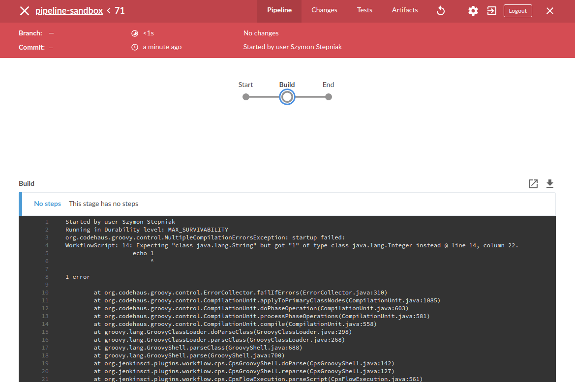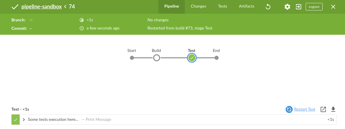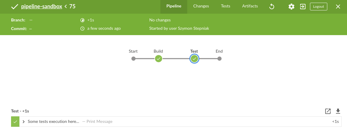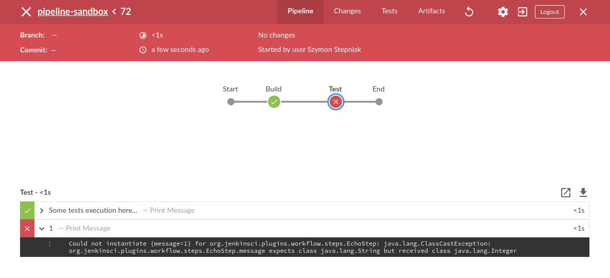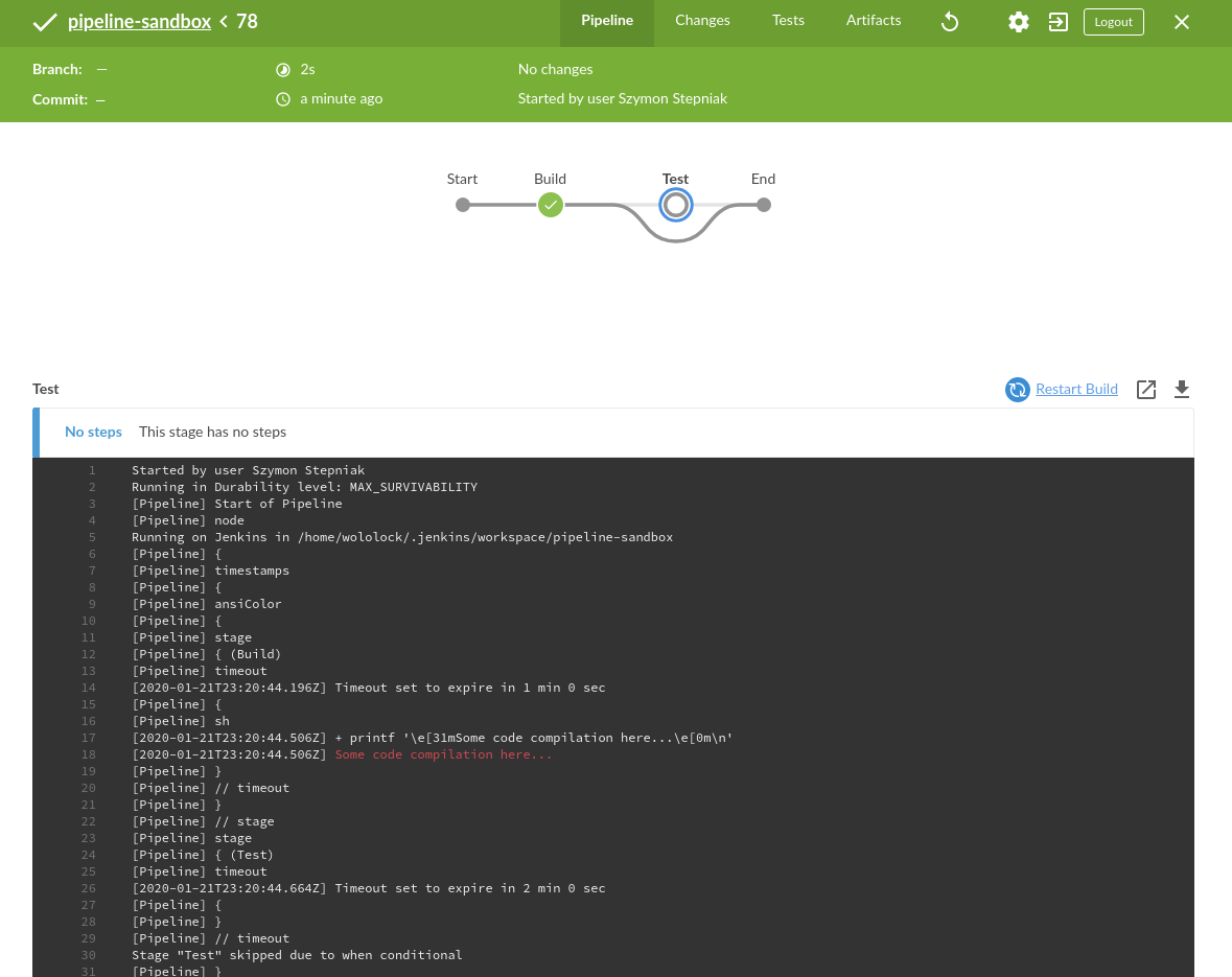 1 2 3 4 5 6 7 8 9 10 11 12 13 14 15 16 17 18 pipeline { agent any stages { stage("Build" ) { steps { echo "Some code compilation here..." } } stage("Test" ) { steps { echo "Some tests execution here..." echo 1 } } } }