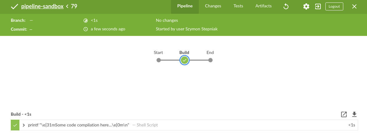 1 2 3 4 5 6 7 8 9 10 11 12 13 14 15 16 17 18 node { timestamps { ansiColor("xterm" ) { stage("Build" ) { timeout(time: 1 , unit: "MINUTES" ) { sh 'printf "\\e[31mSome code compilation here...\\e[0m\\n"' } } if (env.FOO == "bar" ) { stage("Test" ) { timeout(time: 2 , unit: "MINUTES" ) { sh 'printf "\\e[31mSome tests execution here...\\e[0m\\n"' } } } } } }